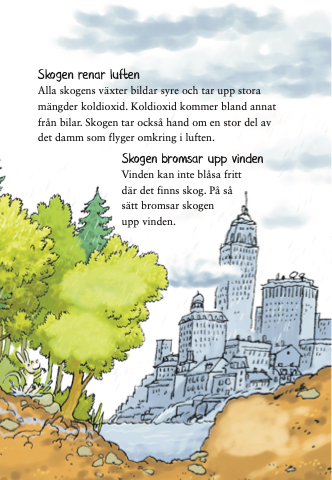 Alla skogens växter bildar syre och tar upp stora mängder koldioxid. Koldioxid kommer bland annat från bilar. Skogen tar också hand om en stor del av det damm som flyger omkring i luften.